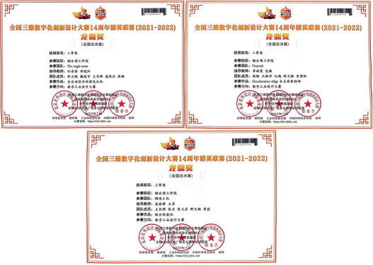 全国三维数字化创新设计大赛(简称“全国 3D 大赛”或 3DDS),是在国家大力实施创新驱动发展战略、推动实体经济和数字经济融合发展的时代背景下开展的一项大型公益赛事,以“三维数字化”与“创新设计”为特色,突出体现科技进步和产业升级的要求,是大众创新、万众创业的具体实践。此项赛事已被教育部列入全国高校学科评估体系。全国3D大赛14周年精英联赛(2021-2022)自2021年9月22日启动以来,全国31个省/直辖市/自治区赛区,大学生组和研究生组共有452所高校,850个院系报名参赛,共提交了7692件初赛作品;职业组共有55个企/事业单位报名参赛;青少年组共有76个院校报名参赛。各赛区、各院校经初赛/校赛、网络海选等方式,共推荐报送省赛团队3681个,作品3681件。我院推选数字工业设计组作品3项进入全国总决赛,喜获佳绩。