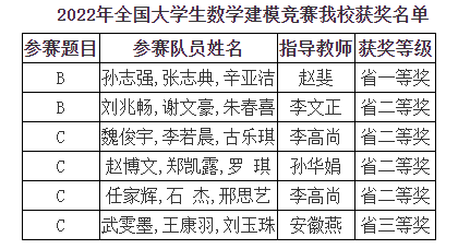 2022年全国大学生数学建模竞赛于9月15日-18日进行,竞赛成绩近日揭晓。我校共有15支代表队成功参赛,获省一等奖1项、省二等奖4项、省三等奖1项。