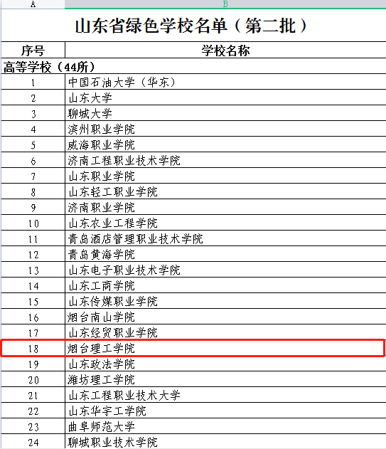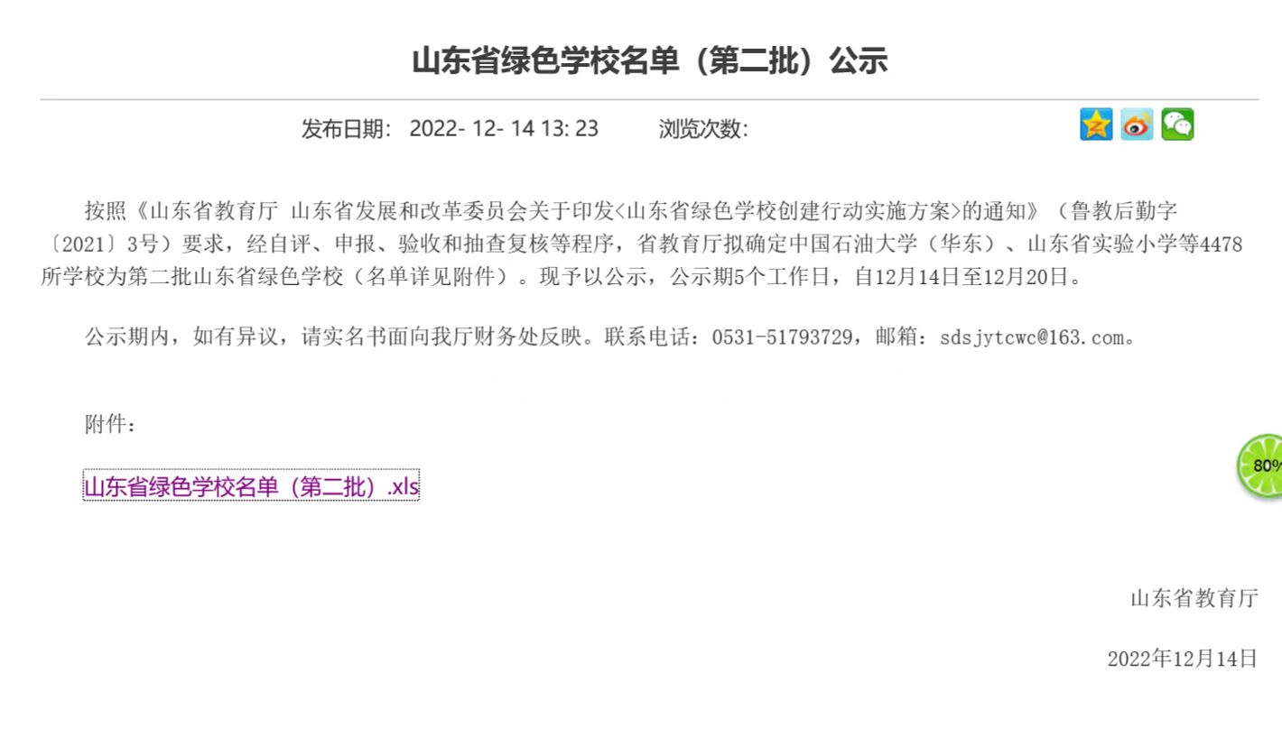 近日,山东省教育厅公示了山东省第二批“绿色学校”名单,我校成功入选。目前为止,全省22所同类高校中第一批有4所入选、第二批有8所入选,我校是其中之一。