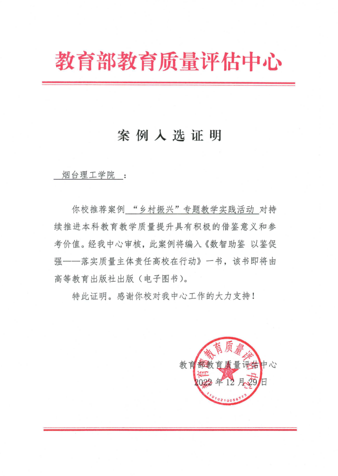 12月29日,烟台理工学院推选由建筑工程学院编写的“乡村振兴”专题教学实践活动入选教育部教学质量评估中心《全国普通高校本科教育教学质量报告》征集案例,此案例将入编《数智助鉴 以鉴促强——落实质量主体责任高校在行动》一书,该书即将由高等教育出版社出版(电子图书)。