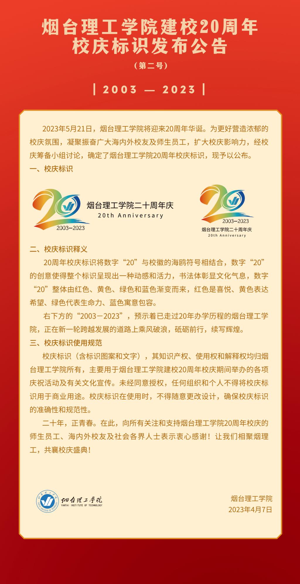 烟台理工学院建校20周年校庆标识发布公告(第二号)