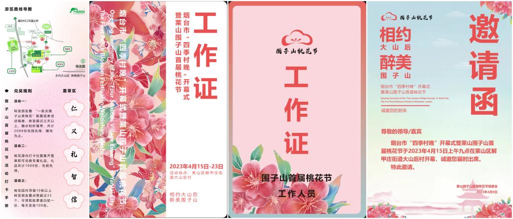 作为2023年“乡村振兴 走进围子山”的第一站,建筑工程学院在莱山区围子山首届桃花节开展了系列“乡村振兴”教学实践活动。视觉传达设计专业和环境设计专业共同完成了此次节事活动的整体视觉设计,包括千米科普长廊(52块展板)的设计制作和12处主题打卡区域的所有平面宣传设计;环境设计专业完成了场地的区域分布设计。