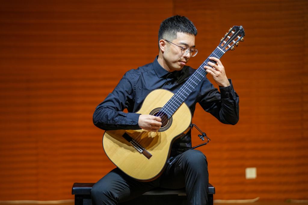 音乐会下半场,薛山老师先是简单介绍了古典吉他的历史和发展,随后带来精彩的古典吉他表演。薛老师深耕南美风格的音乐,在吉他方面造诣颇深,乐曲《华尔兹之爱》《调整》等都是典型的南美风格小品,他的演奏完美表现出华尔兹的律动和优美,也映射出生活中对于自我的积极调整。