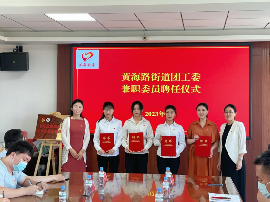黄海路街道相关负责人首先对到场的师生表示热烈欢迎。接下来,团区委副书记刘丹丹、黄海路街道党工委副书记杜琳、会计与金融学院党总支书记曹钊庆、共同为“青年志愿服务基地暨大学生社区实践基地”进行揭牌。黄海路街道团工委聘任林蕾老师、田宜霖同学、于梦君同学、贾艳同学为兼职委员,由刘丹丹书记和杜琳书记为其颁发聘书。曹钊庆进行发言,他非常感谢黄海路街道为学院学子提供了学习交流的机会,架起了结对共建的平台,希望今后能增进彼此间合作力度,深化社会实践与志愿服务,让学院学子能够走出校园,走入社会,不断锻炼和提升能力,更好地服务和回报社会。