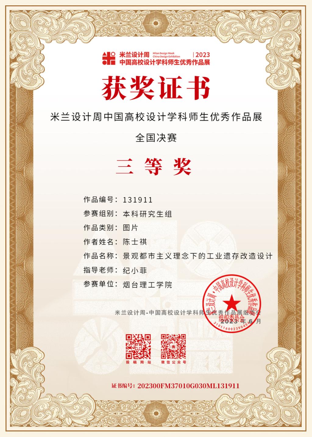 近日,第七届“米兰设计周——中国高校设计学科师生优秀作品展”全国决赛评选结果公布,建筑工程学院获国赛奖3项,其中邹金益、张檬元老师指导的视觉传达设计专业学生(孙彦君、李文轩、薛法磊)团队作品获一等奖2项;纪小菲老师指导的环境设计专业学生(陈士祺)景观设计作品获三等奖1项。
