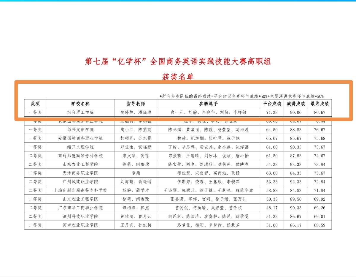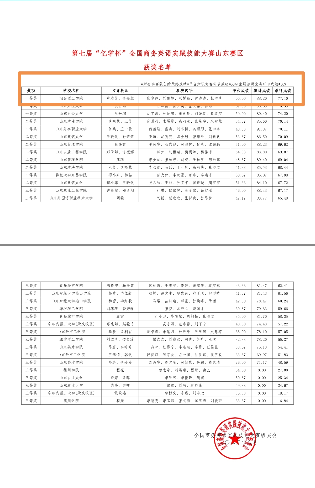8月24日,第七届“亿学杯”全国商务英语实践技能大赛山东赛区和全国赛区圆满落幕,我校外国语学院商务英语本科组和商务英语高职组经过激烈角逐,双双喜获大赛一等奖。