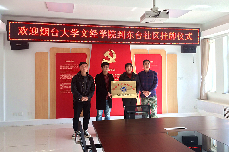 11月14日,烟台大学文经学院经济系志愿服务团队前往东台社区服务中心进行志愿者服务基地挂牌仪式。东台社区主任王艳茹,副主任陈唐鹌,经济系团总支书记陈鹏程老师、辅导员郑家申老师以及志愿服务团队代表参与此次仪式。