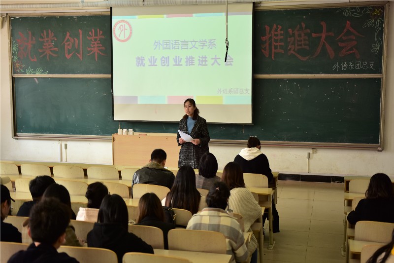 为正确引导外语学子对大学生就业创业形势的认识,增强就业观念,提高创业意识和积极主动性,3月25日下午,外语系于一教306教室组织召开了2019届毕业生就业创业推进大会。外语系党支部书记张廷国、团总支书记温少斐、国际交流学院肖恩霞老师、毕业班班主任及2019届全体毕业生参加了本次会议。