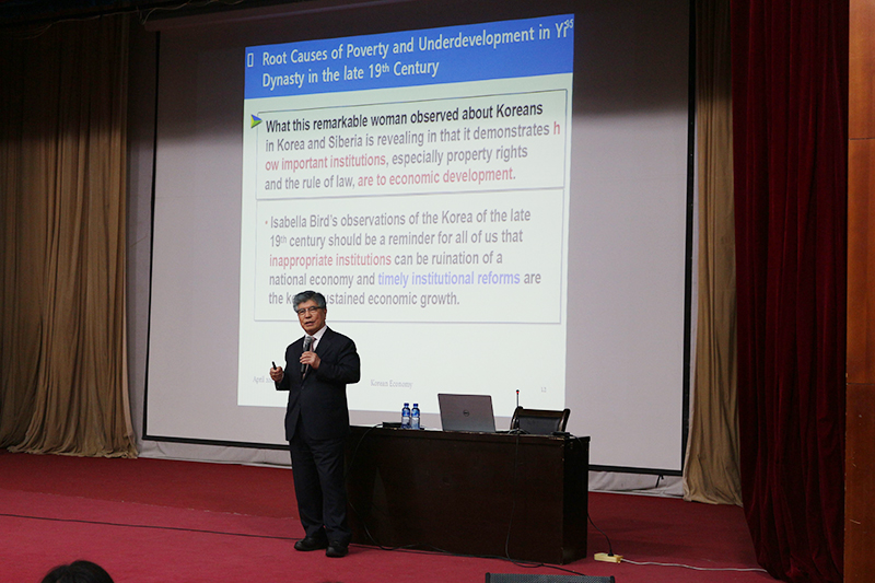 金仲秀校长从韩国的经济发展、经济成功的三个关键因素、克服金融危机韩国的选择和全球金融危机后的新全球问题四个方面,介绍了韩国经济的发展过程。金校长还提出,今后的经济领域随着发展中国家在世界上经济所占比例越来越大,发展经济和稳定气候变化成为发展中国家和发达国家的两个矛盾点,共同协商致力于融合经济与全球经济会成为新的全球经济问题。