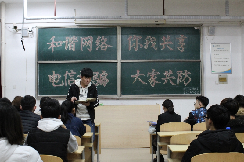 随着网络技术的飞速发展,网络技术的应用深入人们生活的方方面面。为提高同学们的网络安全意识,共同打击虚假信息犯罪,管理系于3月20日晚在一教313举行“防诈骗”校园安全宣讲会,2017级各班班长、团支书参加。