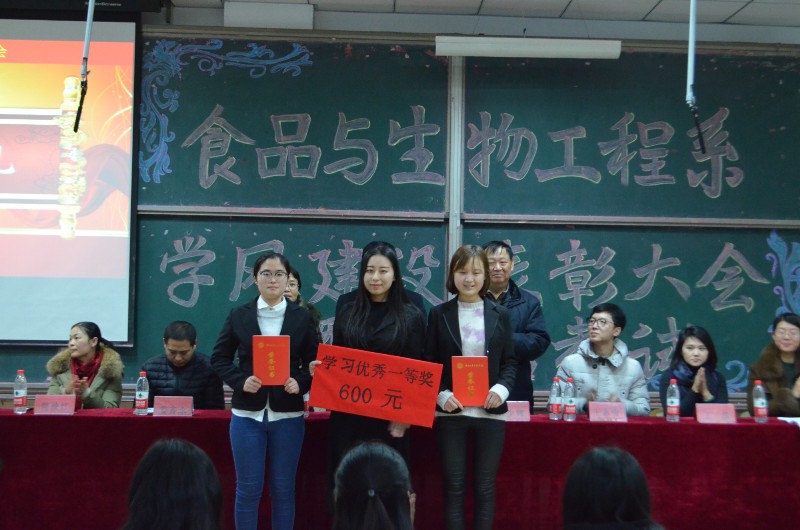 党支部书记王少辉宣读了2017年表彰决定,本次共有98名学生和3个先进班级受到表彰。系领导老师为获奖的学生代表逐一颁奖。希望受到表彰的集体和个人珍惜荣誉,再接再厉,求真务实,开拓进取,再创新佳绩。代表发言环节中,国家奖学金获得者辛易燃讲到,学生要把学习作为自己的第一要务,不断鞭策自己,方能化被动为主动。先进班集体代表文食154-1团支书徐文娟发言讲到,一个优秀的班级要重视全方面的建设,离不开一个集体每个人的努力。