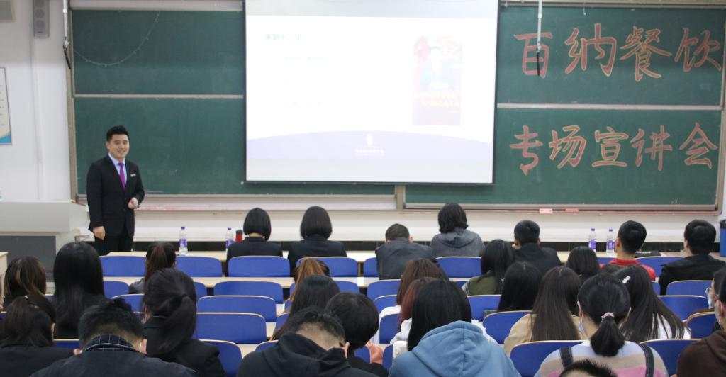 烟台百纳餐饮有限公司餐饮总监、2008级校友刘鹏以个人的奋斗史为例,详细的介绍了公司的发展历程、人才培养计划以及薪酬福利体系,鼓励学弟学妹脚踏实地,在学习阶段积累经验为以后的职场生活打下坚实基础。随后,人力资源总监林丹在总结时对管理学子的专业能力及综合素养给予了肯定与赞扬,希望校企双方进一步拓宽校企生平台,为公司输出更多精英人才。