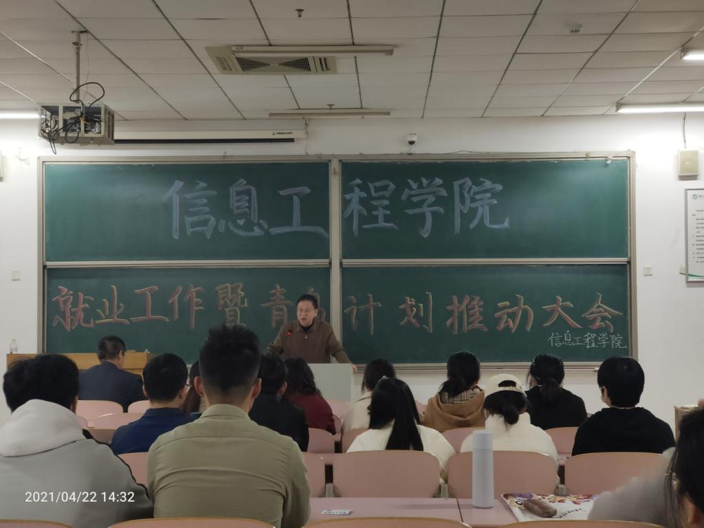 为进一步落实我院毕业生就业工作,切实解决目前存在的实际问题,抓实抓细毕业生就业去向,4月22日下午,信息工程学院在二教A113召开2021届毕业生就业工作暨“青鸟计划”推进会。此次就业工作推进会由辅导员赵怡老师主持,信息工程学院院长宋宜斌老师、党总支副书记王明印老师、就业指导中心褚亮辉老师、团总支书记祝箐老师及学院全体毕业生参加。