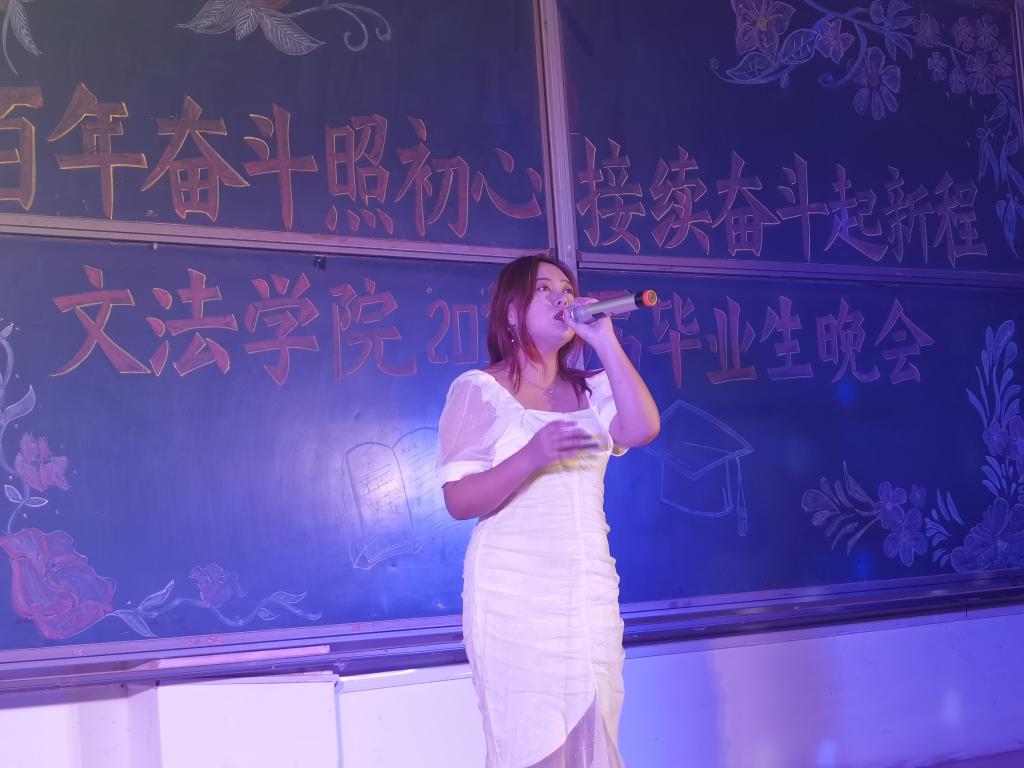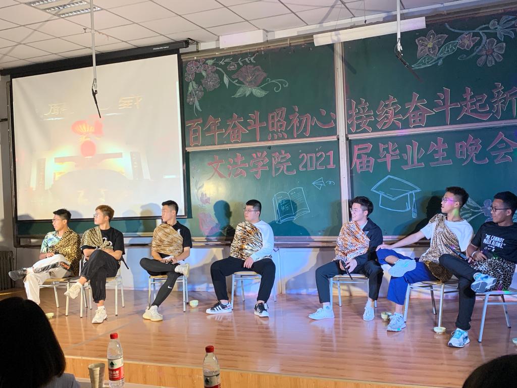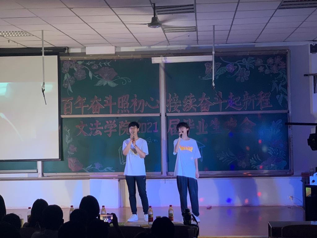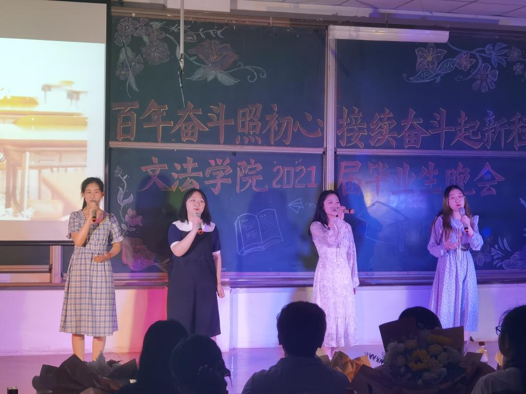 本次晚会共分为“栉风沐雨传承红色基因”“奋斗青春笃定前进航向”“初心永挚逐梦崭新未来”三个篇章。晚会首先通过视频的形式回顾了21届毕业生四年的大学生活,随后通过歌曲、舞蹈、话剧、相声、走秀等多种节目形式表达对毕业生的祝愿。开场曲国乐合鸣《破阵乐》点燃了现场的气氛;话剧《智取威虎山》展现党员豪情;舞蹈《沂蒙女儿》致敬百年峥嵘;歌曲《新征程》聚焦十四五,擎画中国号蓝图;舞蹈串烧《Lip&Hip》《we rock》活泼热烈,欢乐气息弥漫会场;歌唱表演《想把我唱给你听》展现了懵懂美好的校园情谊;反串走秀点燃全场,引起阵阵欢呼。晚会过程中,毕业班班级负责人为班主任送上献花与礼物,他们最后一次以文法学院学生的身份与老师合影留念。最后,一首《不说再见》将晚会拉向高潮,本次晚会圆满落幕。
