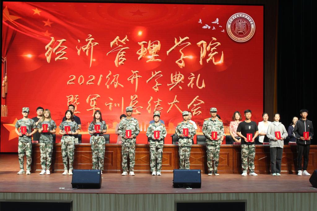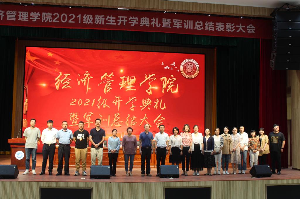 为总结新生军训成果,帮助新生树立新目标。2021年9月24日于实验大楼多功能厅开展21级新生开学典礼暨军训总结大会。经济管理学院院长、党总支书记高照龙、副院长孙相云、副院长殷晓彦、团总支书记李昆峰、国际经济与贸易系主任孙少叶、人力资源管理系主任张俊、跨境电子商务系老师刘娜娜、工商管理系主任姜琳、市场营销系主任郭承鑫以及任课教师、辅导员、2021级新生班的各位班主任老师出席本次大会,大会由团总支书记李昆峰主持,全体新生积极参加。
