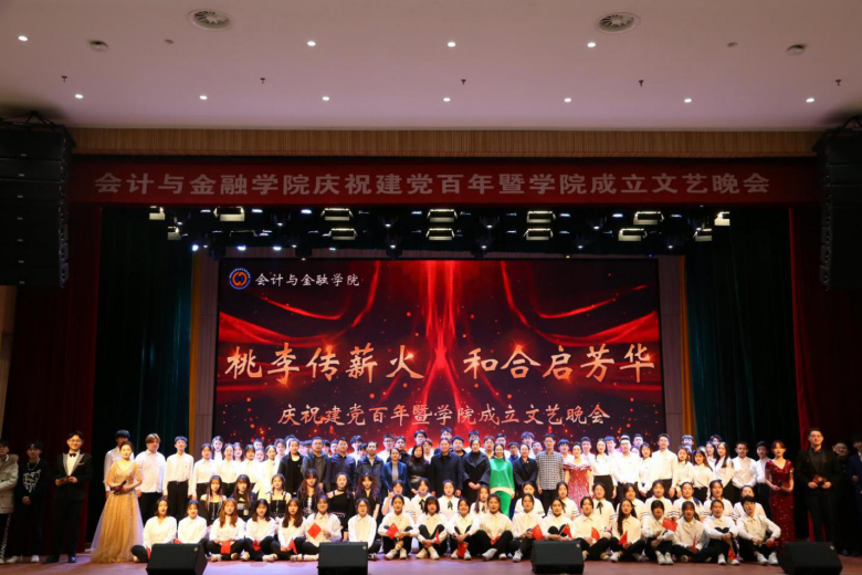 2021年12月15日晚,会计与金融学院于综合楼一楼报告厅举办庆祝建党百年暨学院成立文艺晚会。副校长张仁杰,校长助理莫红菊,校团委书记申海滨,经济管理学院党总支书记高照龙,组织统战部副部长温少斐,文法学院党总支副书记王晓黎,食品与生物工程学院党总支副书记赵蓓,会计与金融学院院长孙桂娟、党总支书记曹钊庆、副院长孔令一,以及会计与金融学院全体教工参加。