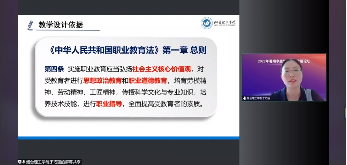 外国语学院常务副院长于巧丽副教授受邀在论坛专场下午的云端教研活动中作题为《基于深度学习的高职公共英语“智慧”听说课程教学设计》的报告。报告从《中华人民共和国职业教育法》的相关要求出发,结合深度学习理论,介绍了高职公共英语听说课程的教学设计、组织与评价方法。报告指出,高职公共英语听说课程应以立德树人为根本,有机融入课程思政元素;坚持以学生为中心,促进学生自主学习能力发展;重视新旧知识之间的关联,有效促进学生的知识建构;重视深度学习场域的构建,实现技术赋能;同时,坚持目标驱动,促进高阶思维能力的发展。