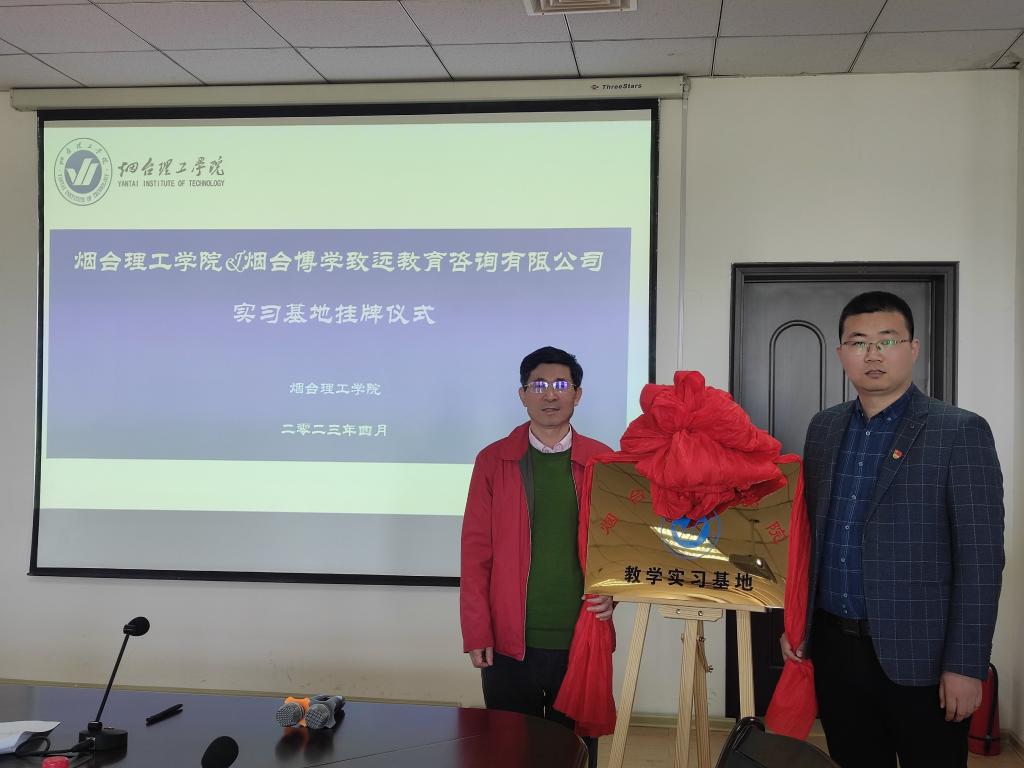 外国语学院院长刘白玉与烟台博学致远教育咨询有限公司校长王卫东现场签约实习基地协议,并进行了实习基地挂牌仪式。