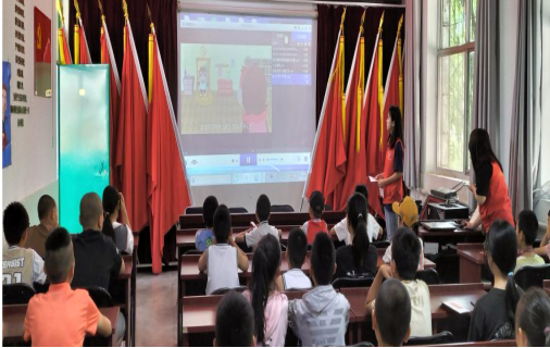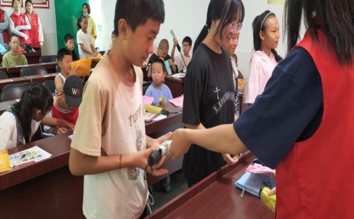 活动中期,志愿者播放了动画片《皮皮的故事》,与同学们一起认识烧烫伤,并教会大家烫伤急救五步骤,远离烫烫小怪兽儿歌。在回顾完动画片后,快进至科学小实验发放感温贴并总结:烫烫小怪兽被封印在感温贴中当温度超过40度的时候,烫烫小怪兽就解开封印了(变红色)红色的烫烫小怪兽不能碰感温贴也是预防烧烫伤的红绿灯。