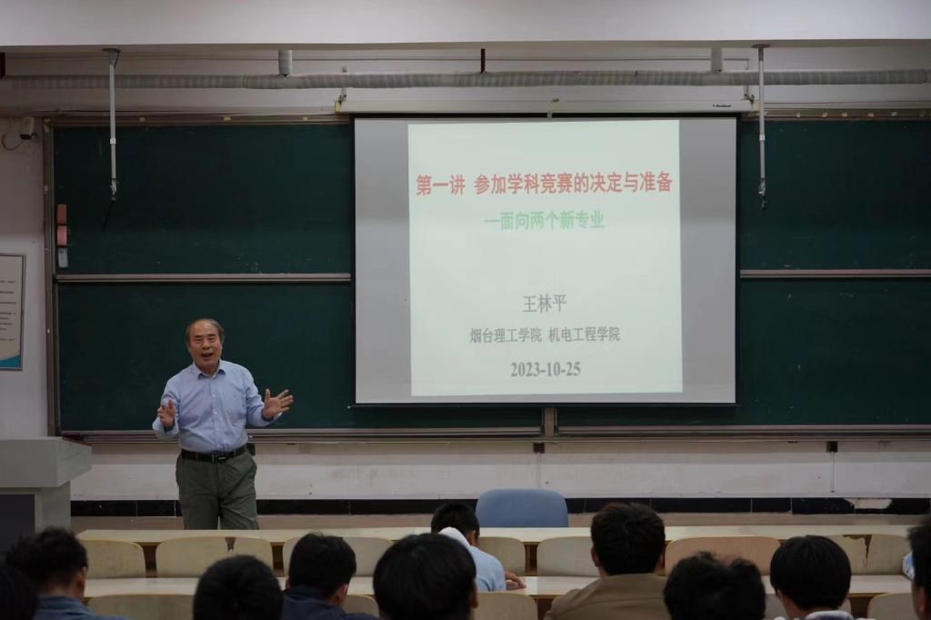 为增强学院的竞赛学习氛围,提高创新实践能力和科研水平,激发学生对学科竞赛的热情,机电工程学院于10月25日晚,在一教106举办了学科竞专题讲座。本次讲座由烟台大学机电汽车工程学院学科竞赛指导专家王林平教授担任主讲,主任教授孟宪辉,2023级智能制造工程、机械电子工程专业全体学生参加本次讲座。